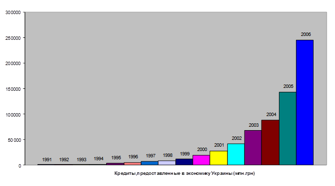 В 1991 году общая сумма кредитов составляла 1млн.грн, в 1992 -27млн.грн, в 1993- 406млн.грн (что примерно в 15раз больше предыдущего года),в 1994году -1558млн.грн, в 1995 году – 4078млн.грн, в 1996 году -5452млн.грн, 1997- 7295млн.грн,1998 – 8873млн.грн. С 1991 по 1998 года большую часть кредитов составляли краткосрочные кредиты в национальной валюте. С 1999 года растёт доля долгосрочных кредитов как в национальной, так и в иностранной валюте. В 1999 году общая сумма кредитов составляла 11787млн.грн, в 2000 – 19574млн.грн, в 2001 году – 28373млн.грн, в 2002- 42035млн.грн, в 2003 году – 67835млн.грн,из них долгосрочные кредиты составили 30553млн.грн. С 2004 года долгосрочные кредиты составляют большую часть общей суммы кредитов. В 2004 году общая сумма кредитов составила 88579млн.грн, в 2005 – 143418млн.грн. В 2006 году -245226млн.грн,из них краткосрочные кредиты составили – 86193,а долгосрочные -159033млн.грн.