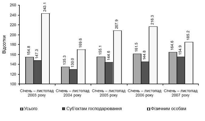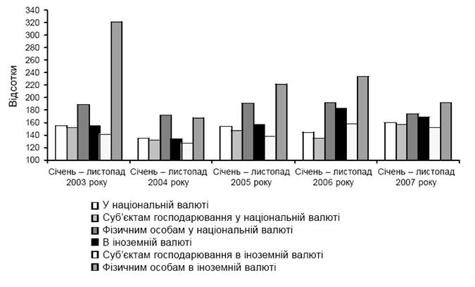 банков и снижению процентных ставок по кредитам сохранялась тенденция к существенному росту кредитных вложений банковских учреждений в экономику Украины. Требования банков за кредитами, предоставленными субъектам ведение хозяйства и физическим лицам, на 01.12.2007 г. составляли 403.6 млрд. грн., увеличившись с начала года на 64.6%, или на 158.4 млрд. грн.(темп прироста в ноябре составлял 5.8% сравнительно с 3.9% в октябре).Показатель прироста кредитных вложений за одиннадцать месяцев 2007 года был наивысшим за все годы независимости, что положительно влияло на динамику экономического роста в Украине.
