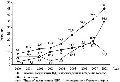 Рис. 1.Поступления и возмещение НДС с произведенных в Украине товаров в 2000-2008 гг.