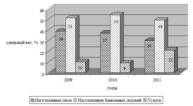 Рис. 2.2.2. Динамика удельного веса видов работ и услуг ООО «Мир окон и дверей» за 2009-2011 гг., %