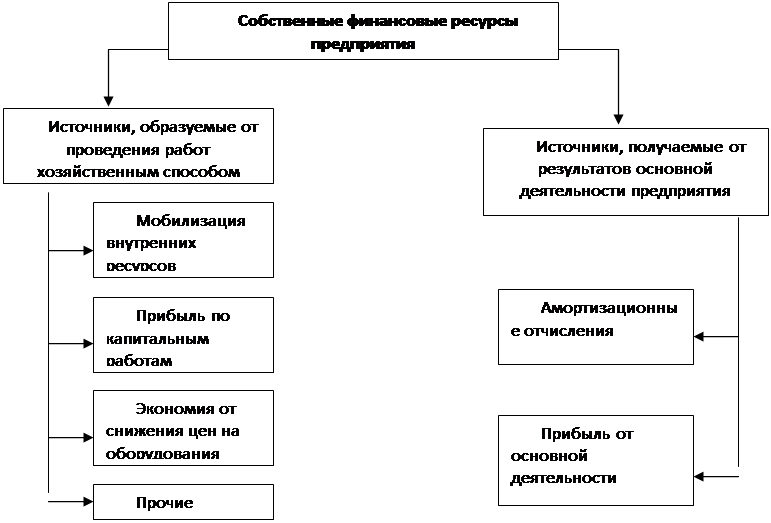 Собственные финансовые ресурсы организации включают взносы учредителей в момент ее формирования и часть денежных средств, полученных в результате хозяйственной деятельности. Традиционно в России финансирование капитальных вложений осуществлялось в основном за счет внутренних источников (Схема 1.)