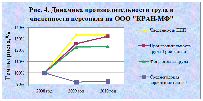 Таким образом, рассмотрев данные рисунка 4 можно выделить, что численность работников предприятия за последний год вообще не изменилась, а по сравнению с 2008 годом увеличилась на 33,33%, производительность труда 1 работника за 3 года увеличилась на 32,29%, фонд оплаты труда за 3 года увеличился на 23,24%, а среднегодовая заработная плата за 3 года снизилась на 7,57%, т.к. произошёл скачок численности работников.