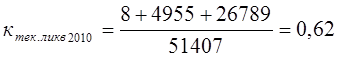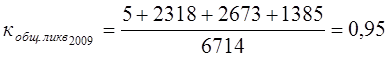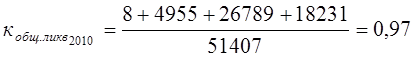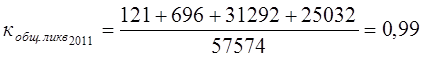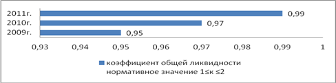 Коэффициент общей ликвидности имеет тенденцию к увеличению данного показателя. В 2011 г. данный коэффициент достиг границы нормативного значения и составил 100%, то есть, если предприятие направит все свои оборотные активы на погашение долгов, то оно ликвидирует краткосрочную кредиторскую задолженность на 100%.