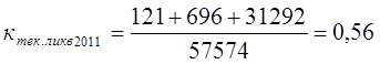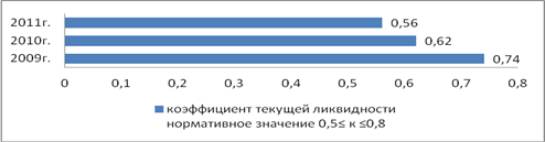 Коэффициент абсолютной ликвидности за весь рассматриваемый период не соответствует нормативному значению и имеет тенденцию к снижению. В 2011 г. он составил 1%. Это значит, что только 1% (из необходимых 20%) краткосрочных обязательств предприятия, может быть немедленно погашено за счёт денежных средств и краткосрочных финансовых вложений.