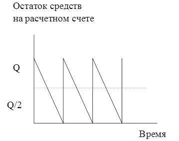 Модель Баумола. Предполагается, что предприятие начинает работать, имея максимальный и целесообразный для него уровень денежных средств, и затем постоянно расходует их в течение некоторого периода времени [9].