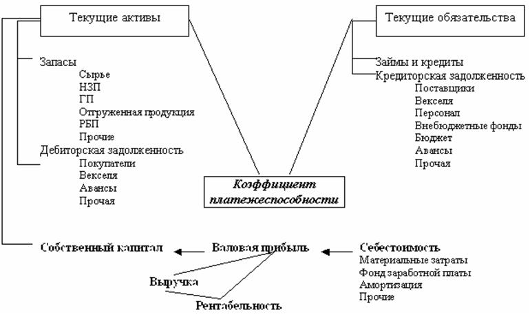 В качестве модели необходимо использовать ключевой показатель, наиболее полно отражающий интересующие нас аспекты. Таким показателем может быть платежеспособность предприятия, являющаяся внешним проявлением финансового состояния предприятия. Данный показатель дает качественную характеристику финансового состояния, т.е. возможности наличными денежными ресурсами своевременно и полностью производить расчеты с бюджетом по налогам, с банками и кредиторами — по ссудам и процентам за кредит, с поставщиками — по поставкам и услугам и с трудовым коллективом — по оплате труда и социальными гарантиями.