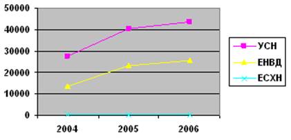 тыс. руб., а если сравнить 2005 год с 2004 годом наблюдается рост на 146,9% или на 40485 тыс.руб. По ЕНВД если сравнить 2005 год с 2004 годом видно на 69,6%, что составляет 23061 тыс. руб., а если сравнить 2005 год с 2006 годом, то виден рост на 11,8% или на 25783тыс. руб. А по ЕСХН тоже наблюдается, если сравнить 2004 год с 2005 годом увеличение на 4,8% или на 309 тыс.руб., а если сравнить 2005 год с 2006 годом видно увеличение на 26,5% или на 391 тыс. руб. т.е. на 82 тыс. руб.И в общем можно сделать вывод, что по налогам взимаемым на территории КЧР по специальным налоговым режимам наблюдается увеличение и хотя оно небольшое, но имеет стабильный характер.