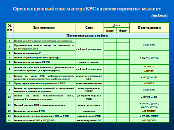 За 15 дней до начала ремонта скважины мастером по КРС после получения сетевого графика составляется организационный план на ремонтируемую скважину, включающий в себя (рисунок 3.1.6):