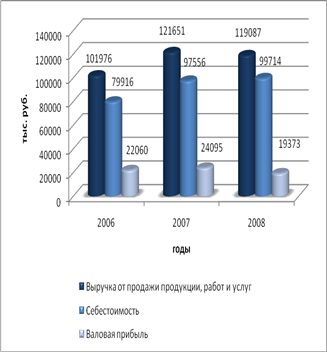 Как видно из таблицы в динамике наблюдается рост выручки от реализации со 101976 до 119087 тыс. руб., однако своего максимального значения выручка достигла в 2007 году – 121651 тыс. руб. Таким образом, за период 2006-2008 гг. выручка выросла на 16,78%.