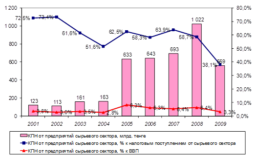 Тенденция роста сложившаяся за последние годы по налоговым поступлениям от недропользователей в 2009 г. сменилась на небольшое снижение. В 2009 г. налоговые поступления от недропользователей составили 1 467,8 млрд. тенге, уменьшившись относительно 2008 г. на 273,2 млрд. тенге (на 15,7%), в основном, за счет сокращения КПН от предприятий сырьевого сектора на 45,2%. [46]