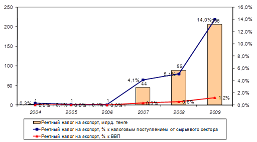 В период 2007-2009 гг. налоговые поступления от рентного налога на экспорт ежегодно росли больше чем в 2 раза. Главным образом, это связано с увеличением объема экспорта нефти и газового конденсата за этот период с 60,8 млн. тонн до 67,3 млн. тонн. В 2009 г. налоговые поступления от рентного налога на экспорт достигли 205,6 млрд. тенге, увеличившись по сравнению с 2008 г. на 117,1 млрд. тенге (в 2,3 раза), что составили 14% от всех налоговых поступлений недропользователей (Рисунок 7). [46]