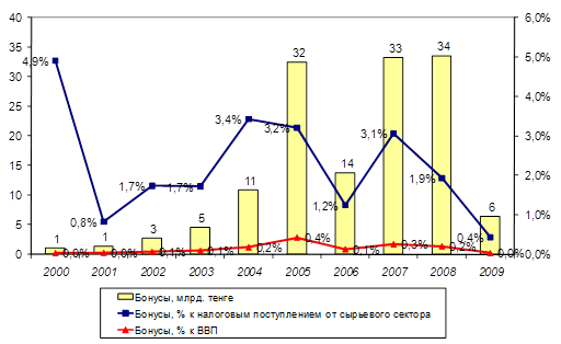 В 2009 г. тенденции по росту поступлений бонусов сменились к снижению, что объясняется ухудшением и снижением объема геолого-разведочных работ в период мирового финансового кризиса в 2007-2008 г. В 2009 г. налоговые поступления от бонусов уменьшились до 6,4 млрд. тенге, сократившись по сравнению с 2008 г. на 27,2 млрд. тенге (на 81%), что составили 0,4% от всех налоговых поступлений недропользователей (Рисунок 8).[46]