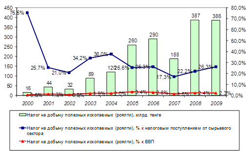 В 2009 г. рост налоговые поступления от налога на добычу полезных ископаемых (НДПИ) (роялти) сменился на незначительное падение, что объясняется эффектом перехода от роялти к НДПИ, а также небольшим снижением деловой активности недропользователей. В 2009 г. налоговые поступления от НДПИ (роялти) снизились до 385,7 млрд. тенге, уменьшившись по сравнению с 2008 г. на 1,6 млрд. тенге (на 0,4%), что составили 26,3% от всех налоговых поступлений недропользователей (Рисунок 9).