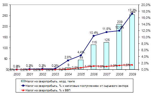 Несмотря на послабления, установленные Налоговым кодексом по возникновению обязательств по уплате налог на сверхприбыль (далее - НСП), налоговые поступления от НСП в 2009 г. достигли 254,1 млрд. тенге, увеличившись по сравнению с 2008 г. на 45 млрд. тенге (на 21,5%), что составили 17,3% от всех налоговых поступлений недропользователей (Рисунок 10). [46]