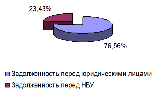 равняется 14953,5 млн. грн., или 18,7%, государственный внешний долг – 64886,6 млн. грн., или 81,3%. В структуре государственного внутреннего долга задолженность перед юридическими лицами составляет 11449 млн. грн., или 76,56% от общей суммы внутреннего долга, задолженность перед Национальным банком Украины составляет 3503,5 млн. грн., или 23,43% соответственно.