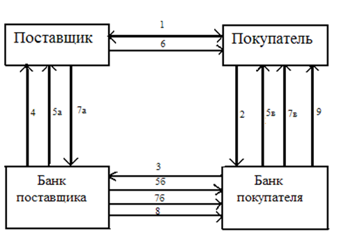1 – договор о сделке; 2 – заявление на аккредитив; 3 – распоряжение на открытие непокрытого аккредитива; 4-открытие аккредитива (депонирование средств); 5а, 5б, 5в – извещение об открытии аккредитива; 6 – выполнение предмета договора; 7а, 7б, 7в – передача пакета документов с подтверждением (авизование); 8 – направление в банк покупателя сообщения об использовании аккредитива; 9 – сообщение покупателю об использовании аккредитива [17, С. 89].