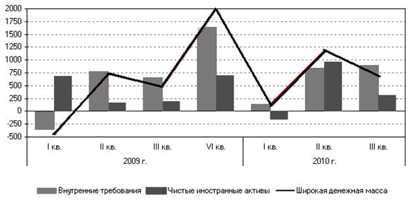 Рис. 2.4. Основные источники изменения широкой денежной массы в 2009–2010 гг. (прирост за квартал, млрд. руб.) [31]