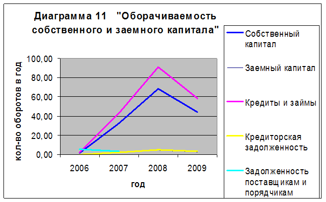 Из нее четко видно, что оборачиваемость активов росла до конца 2008 года по всем показателям. Связано это с тем, что с начала 2006 года до конца 2008 года постоянно увеличивалась выручка от продаж: в 2006 – 1 692 тыс. руб., 2007 – 32 481 тыс. руб., 2008 – 68 154 тыс. руб. В 2009 году выручка сократилась на целых 36 % и составила 43 911 тыс. руб. В связи с этим и ухудшилась оборачиваемость оборотного капитала.