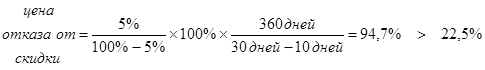 · Скидка 5/10-30, т.е. предложим дебиторам скидку 5% при выплате задолженности в 10-дневный срок при максимальной длительности отсрочки 30 дней. Рассчитаем в этом случае цену отказа от скидки: