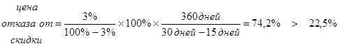 · Скидка 3/15-30. Цена отказа от скидки при этом составляет 74,2%. (74,2% - 22,5%) = 51,7%. Т.е. при таком расчете отказ от скидки обойдется на 51,7 процентных пункта дороже банковского кредита.