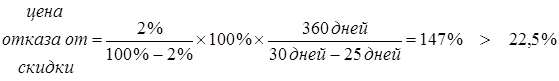 · Скидка 2/25-30, т.е. предлагаем скидку 2% и увеличиваем срок выплаты задолженности до 25 дней. Рассчитаем в этом случае цену отказа от скидки: