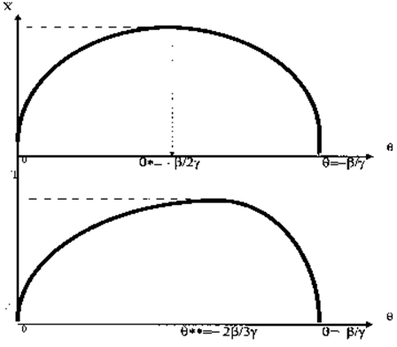 Однако самым важным и интересным представляется вывод о несовпадении точек Лаффера первого и второго рода, причем точка Лаффера второго рода смещена вправо по налоговой оси относительно точки первого рода: q**>q* (это непосредственно вытекает из формул (19)-(20) и хорошо видно на рисунке при геометрическом наложении производственной и фискальной кривых). Таким образом, производственная и фискальная кривые характеризуются различной степенью кривизны. Можно сказать, что фискальная кривая получается в результате деформации производственной кривой в сторону ее правого края. Максимальное значение объема производства X*, приходящееся на точку Лаффера первого рода, составляет максимальное значение массы взимаемых налогов T*, приходящееся на точку Лаффера второго рода, составляет: