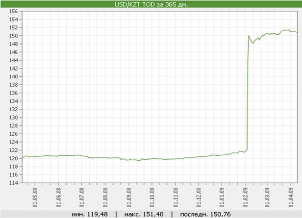 С начала 2008 года по январь 2009 года снижение курса тенге к доллару составило 1%. В 2008 году официальный курс тенге "дрейфовал" в районе 120 тенге/$1. Казалось, бури и штормы мирового финансового кризиса его не касаются.