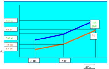 Как видно из диаграммы - доход от сдачи в аренду помещений растет из года в год. Также растет и доля доходов от аренды в общей структуре доходов от предпринимательской деятельности с 27,12 % в 2007 году до 60,54 % в 2009 году.