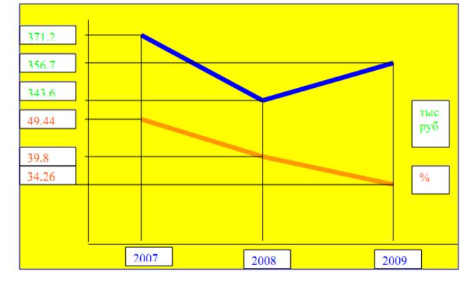 Как показывает диаграмма - динамика поступлений от платной образовательной деятельности весьма нестабильна и имеет тенденцию к снижению. Также снижается и доля доходов от платной образовательной деятельности в общей структуре доходов от предпринимательской деятельности МОУ ДОД ДЮСШ Мирного, в 2007 г. -49,44 %, в 2008 году - 39,18 % в 2009 году - 34,26 %.