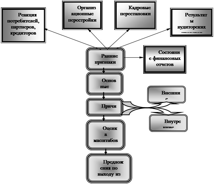 Одной из самой главной кризисной ситуации является то, когда предприятие находится на грани банкротства. Основным признаком банкротства является неспособность предприятия обеспечить выполнение требований кредиторов в течение трех месяцев со дня наступления сроков платежей. По истечении этого срока кредиторы получают право на обращение в арбитражный суд о признании предприятия - должника банкротом. По истечении этого срока кредиторы получают право на обращение в арбитражный суд о признании предприятия - должника банкротом.