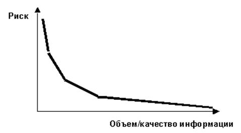 На рис.1.4 показана предполагаемая зависимость вероятности риска принятия некачественного (убыточного) решения и объема/качества информации.