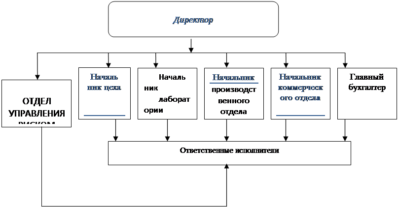 Отдел управления риском является логичным дополнением к традиционно самостоятельным функциональным подсистемам предприятия и располагается на одном управленческом уровне с ними. Отобразим, на рисунке 2.1., иным образом, но не меняя сути, схематично структуру управления при введении отдела управления риском. Здесь наш отдел координирует деятельность функциональных подразделений предприятия через ответственных исполнителей.